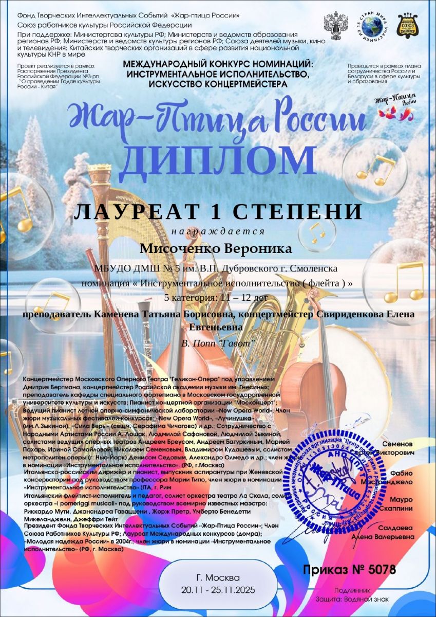 Поздравляем Денисенкова Аленксандра со званием лауреата 1й степени международного конкурса для номинаций: Инструментальное исполнительство, Искусство концертмейстера среди исполнителей 15 стран мира "Жар-птица России"
