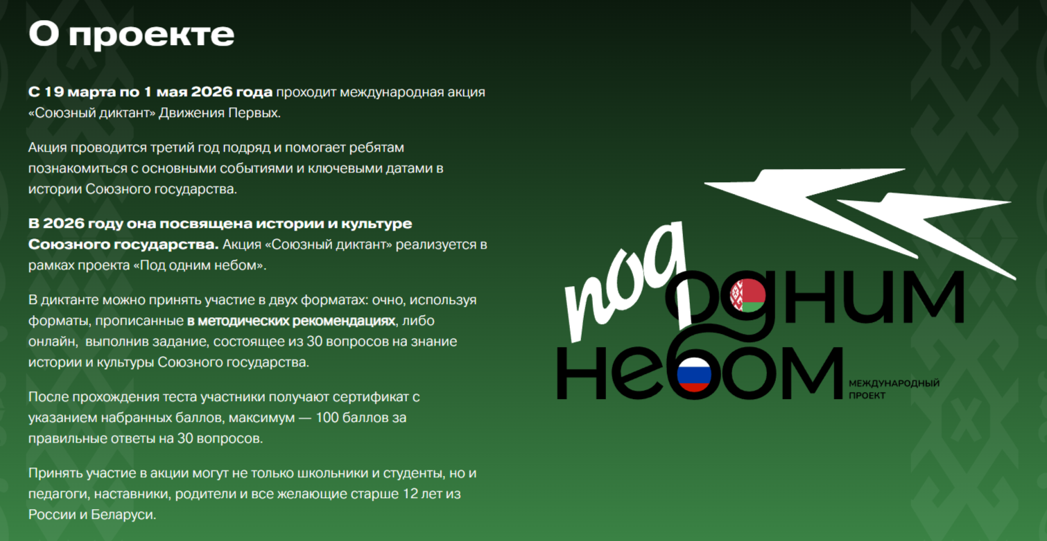 С 19 марта по 1 мая 2026 года проходит международная акция «Союзный диктант» Движения Первых, реализуемая в рамках проекта «Под одним небом». Диктант посвящён истории и культуре Союзного государства.
