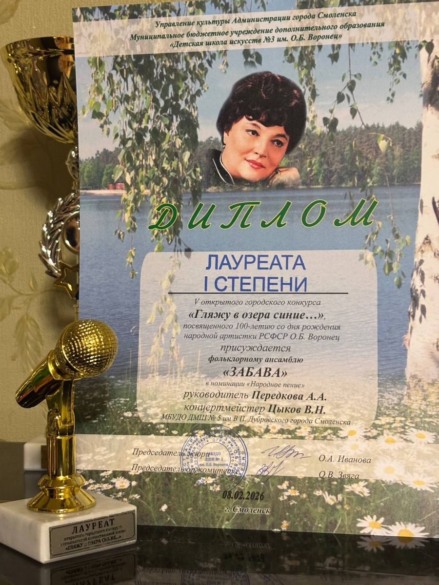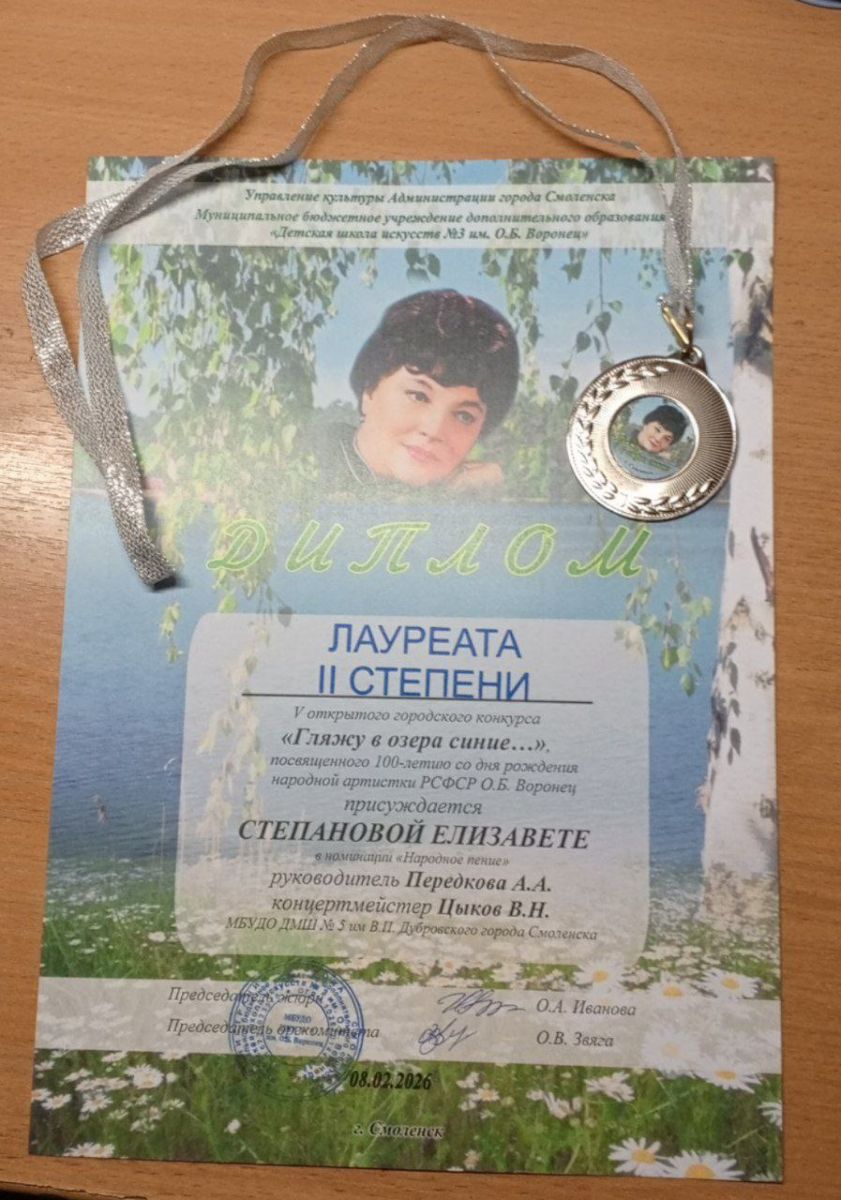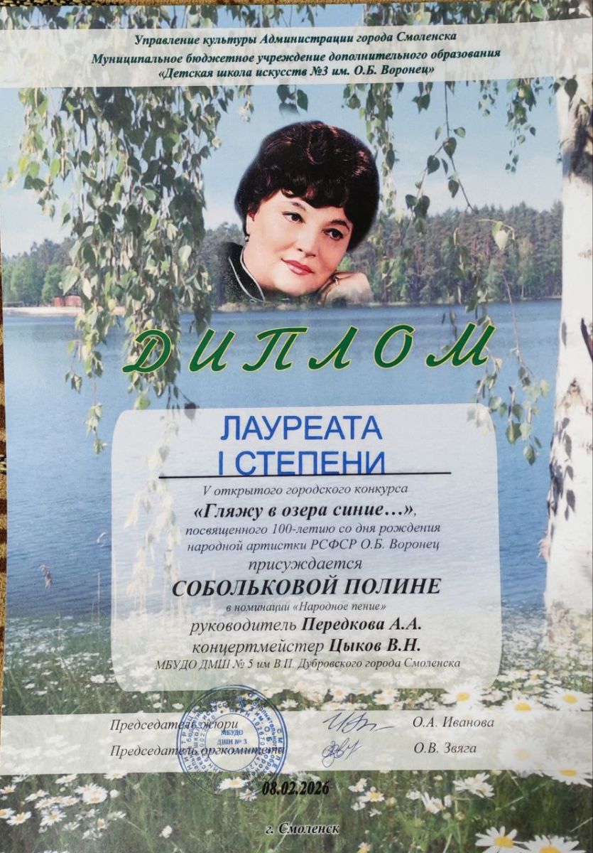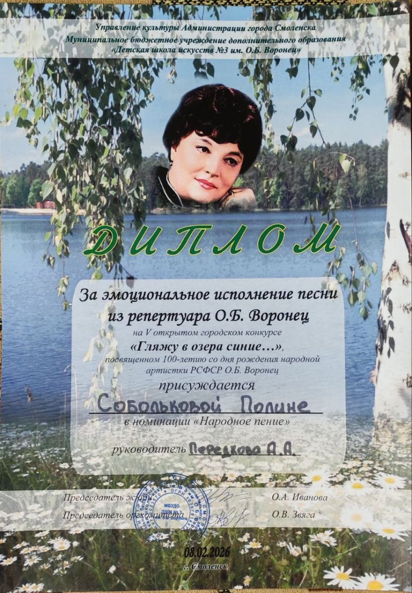Поздравляем наших обучающихся с успешным выступлением на 5м открытом городском конкурсе "Гляжу в озера синие..." посвященном 100-летию со дня рождения народной артистки РСФСР О.Б. Воронец присуждается Собольковой Полине в номинации "Народное пение"